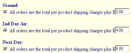 A shipping charge field for each delivery method (next day, second day, etc) will appear on the Add New Product and Edit Product Info pages (advanced editing). You can also use the Power Edit Pages or Database Upload features to set shipping charges for each product. By default, three delivery methods are enabled, but you can enable up to 10 or disable any that you don’t need. You can change the names of the delivery methods in Preferences > Store Text > Shipping.