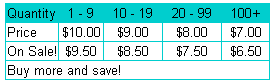 Product Quantity Pricing allows you to set the price of a product based on the quantity a customer orders. For example, you could charge full price for orders of less than 10 units, reduce the price for orders of 10 to 20 units, and reduce the price even more for orders of more than 20 units. You can also set a sale price for each quantity level. A Product Quantity Pricing table for a product might look like this in a store: