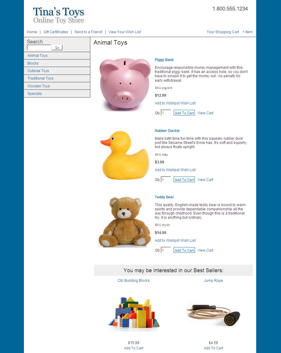 The Cross Sell template puts the universal header at the top of the page, with a row of links across the page below it. These links can include customer registration, Tell A Friend, minicart, and Gift Certificates, if they are enabled. There is a block on the left-hand side of the page that contains the search feature (if enabled) and page links. Products are displayed to the right of the page links. The Cross Sell theme supports all the features in the current version of ShopSite.