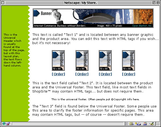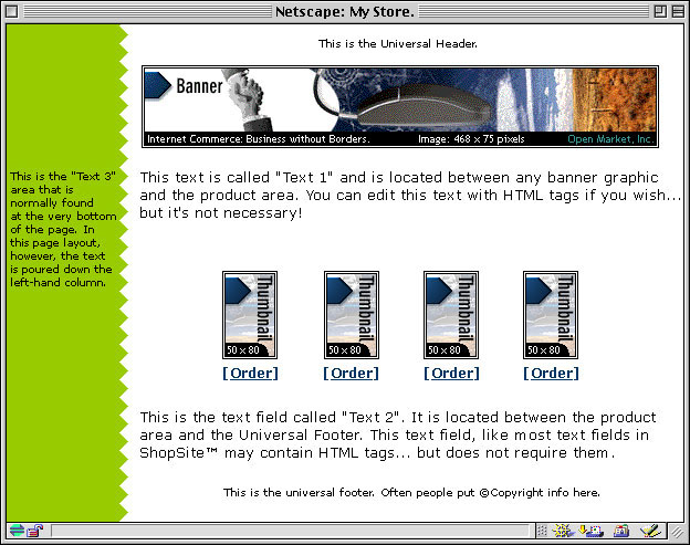 The default template uses a straight-forward "top to bottom" approach. The universal header is placed at the top of the page, followed by the banner graphic and the Text 1 field. Any products and links to other pages appear under the Text 1 field. The Text 2 field is under the links, and the bottom of the page has the universal footer and then the Text 3 field. |
