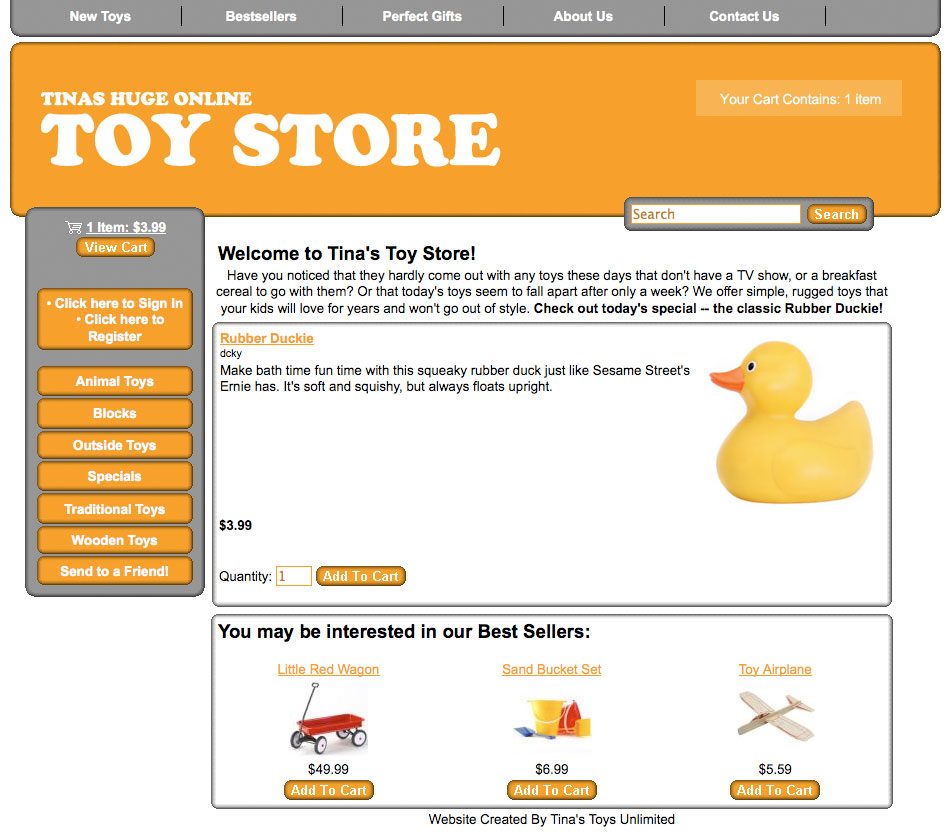 The Classy Page template displays the universal page header in a colored banner at the top. Page links and the search field (if available) will appear in the left-hand column. The center column displays the product list. A third column contains customer registration, minicart, gift certificate, and Tell A Friend information if they are on. The color used for the banner and the left-hand and right-hand columns is the Shopping Cart Shade Color. The Classy Theme supports all the features in the current version of ShopSite. |