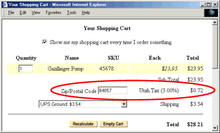 ShopSite Pro and ShopSite Manager stores can calculate tax based on customer ZIP/postal codes and a merchant-supplied rate table. You're assured of always collecting the tax rate that you set for the customer's shipping address.