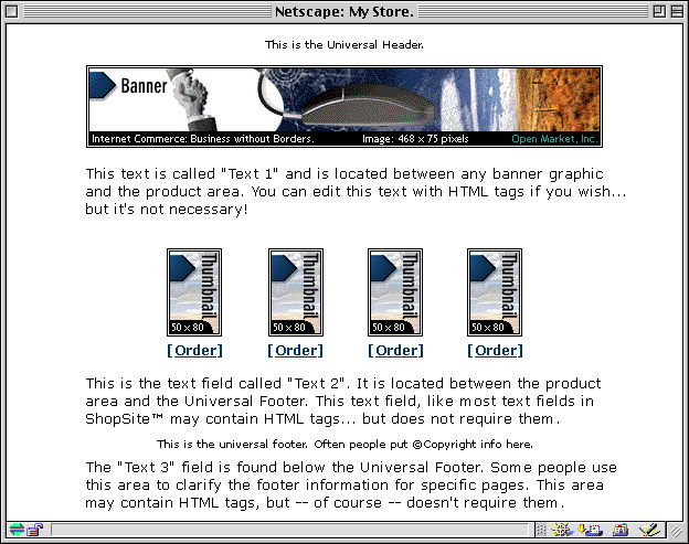 The default template uses a straight-forward "top to bottom" approach. The universal header is placed at the top of the page, followed by the banner graphic and the Text 1 field. Any products and links to other pages appear under the Text 1 field. The Text 2 field is under the links, and the bottom of the page has the universal footer and then the Text 3 field.