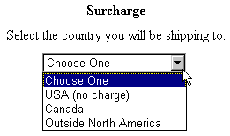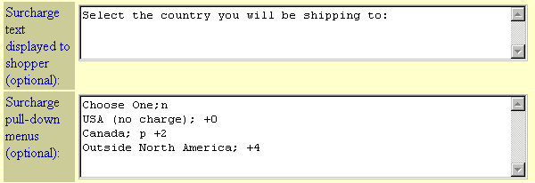 To create a drop-down list of surcharges, enter a description of the surcharge in the Surcharge Text box. Then enter each possible surcharge on a line by itself. Each line must have the name of the surcharge (e.g., country) that you want to show up in the drop-down list, followed by a semi-colon (;) then an operator character, and the value to add or subtract. Valid operators are: