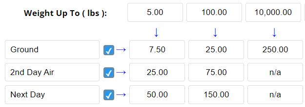 Each row in the table represents a delivery method (e.g. Ground, Next Day, etc), and you can display any number of rows between 10 and 100, but you don’t have to use all of them. Each column in the table represents a weight and there can be between 20 to 200 columns. For each weight and delivery method, enter the shipping charge.