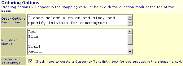 The ordering options feature allows customers to specify options for a product, such as color and size. The options choices can appear with the product listing in your store and on the order form, or just on the order form. The customer's choices will appear with the report of the sale in the e-mail notification and in the Orders section of ShopSite.