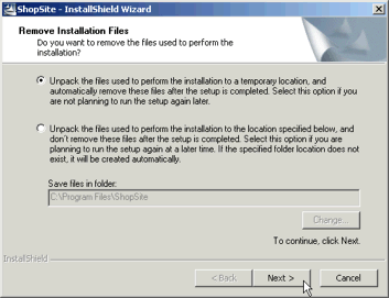- The first screen gives you the option of unpacking the install files to a temporary location or to a folder that you specify. For normal installation, and to save disk space, select the temporary location and click Next to continue. If you plan to run the setup program frequently, select the second option and specify a file location.