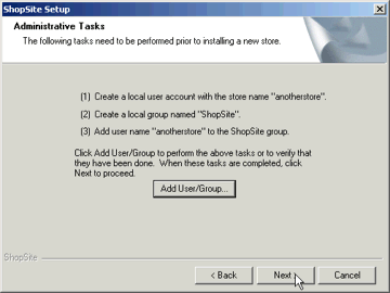 - If you did not create a user account for the merchant before running the setup program, click the Add User/Group button on the Administrative Tasks screen to launch the appropriate IIS application.