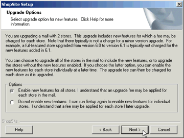 - On the Upgrade Options screen, select how you want the new features in version 7.0 to be enabled for stores. For stores that are not already at version 6.0 or higher, there may be a fee if the new features are enabled. Choose whether to enable the new features for all stores, or to leave the features "grayed out" so that you can enable the features later for individual stores.