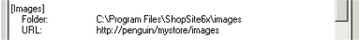 - Images - Identifies the path and URL of the folder containing the common images used by all ShopSite stores.