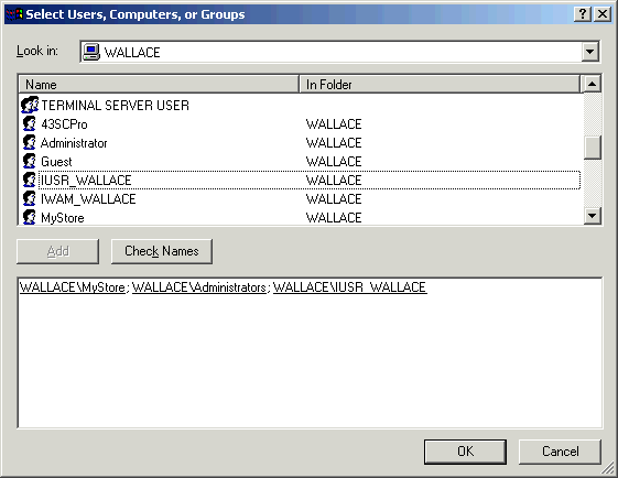 - Select the Internet Guest Anonymous Access account and click the Add button. The name for the anonymous account will usually be IUSR_ServerName.