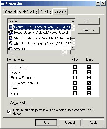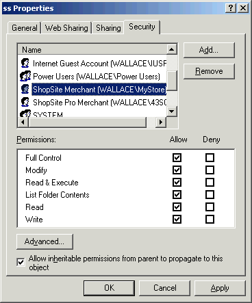 - Repeat the above steps to set the permissions on all ShopSite directories to match this table (the Administrator account should always have Full control):