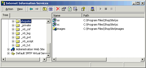 - From the Internet Informatin Services window, click the shopsite directory in the left pane so that the sc, ss, and images directories are visible in the right pane.