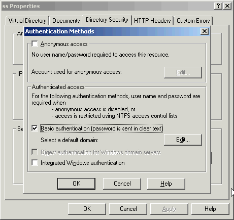 - Click the Directory Security tab, then click the Edit button in the Anonymous access and authentication control section.
