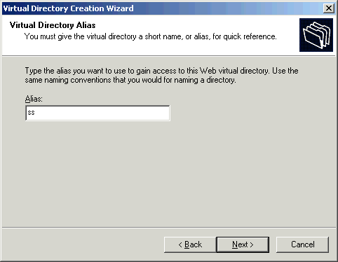- Click Next to advance to the Virtual Directory Alias screen. Enter "ss" as the alias for the ShopSite virtual directory.