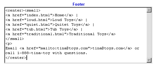 Use this screen to create a standard header or footer to appear on every page in your store. You might want to include links to important documents, or your e-mail address, phone number, or copyright information. If you are familiar with HTML, you can even create a graphical navigation bar.