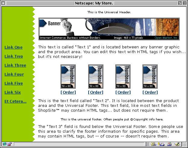 The default template uses a straight-forward "top to bottom" approach. The universal header is placed at the top of the page, followed by the banner graphic and the Text 1 field. Any products and links to other pages appear under the Text 1 field. The Text 2 field is under the links, and the bottom of the page has the universal footer and then the Text 3 field. |