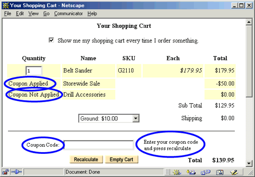 Use the fields on this screen to enable the Coupons by Code feature and to set the text of coupon messages that appear in the shopping cart. This picture shows some of the text you can change: