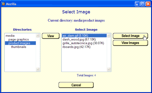 Wherever you can select an image in the back office, ShopSite displays a Select button. When you click that button, a smaller Select Image window will open in front of the ShopSite window. The Select Image window lists directories and images similar to the Images screen, like this: