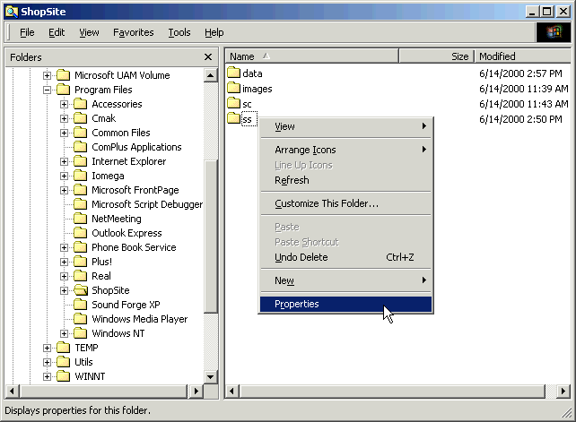 - From the Internet Informatin Services window, click the shopsite directory in the left pane so that the sc, ss, and images directories are visible in the right pane.