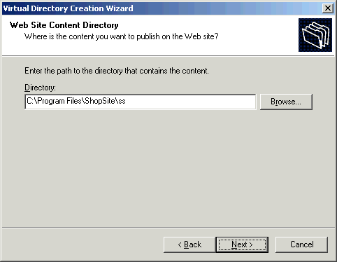 - Click Next to advance to the Virtual Directory Alias screen. Enter "ss" as the alias for the ShopSite virtual directory.