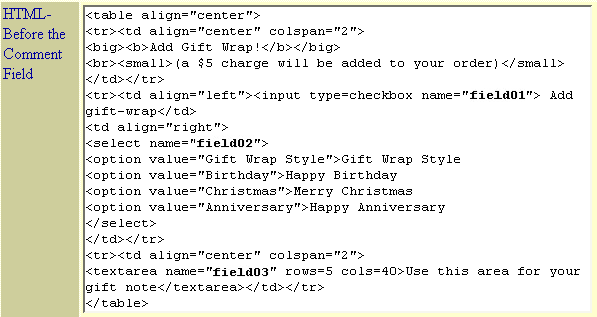 - There are five locations on the checkout screen where custom fields can be placed, but for this example all three custom fields will appear together just below the order total and before the comment field. The HTML code to do this creates a table to control the layout, and uses form fields for the customer input. The essential step is to use the custom field names (field01, field02, etc., shown in bold below) in the form to link the input fields to the defined custom fields. Here is the HTML Before the Comment Field with the complete code:
