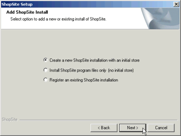 - Select Create a new ShopSite installation with an initial store on the Add ShopSite Install screen to install ShopSite on your server.
