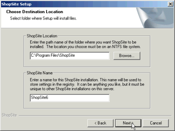 - On the Choose Destination Location screen, click Next to install ShopSite in the default location. Type a new location or click Browse to specify other locations for ShopSite files. (The rest of these instructions assume you've chosen the default location.) You can also enter a name for this installation of ShopSite, to differentiate it from other installations on the same server.