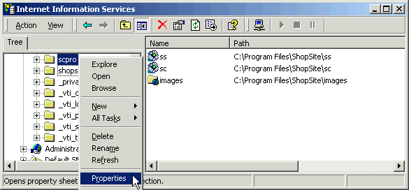 - From the Internet Informatin Services window, click the shopsite directory in the left pane so that the sc, ss, and images directories are visible in the right pane.