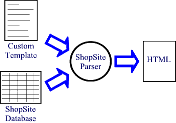 When ShopSite publishes a store that uses custom templates, the ShopSite parser finds all the custom template tags in the template and replaces them with information from the ShopSite databases.