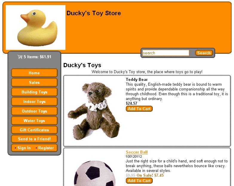 The Sidebar theme is similar to the Lefty theme, but with a little more finesse. The page graphic and navigation links are in the left column, and text fields and product information are in the main column.