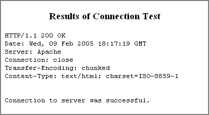 Click the Test button to test whether a connection to the Web server can be opened successfully using the settings on this screen. A successful test result looks like this: