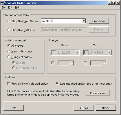 3. The next screen contains all of the order download options. The Properties button and Preferences button are described elsewhere in the help; all other options are described below.
