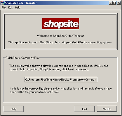 If you want to download orders into this company file, click Next. If this is not the correct company file, click Exit and open the correct company file in QuickBooks before restarting ShopSite Order Transfer.