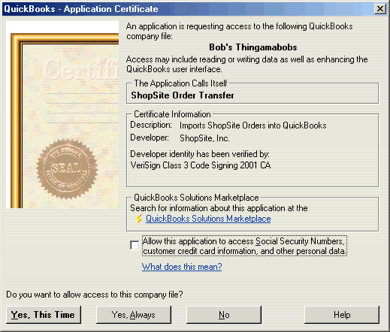 1. If you are running QuickBooks 2004 or later and you want to download customer credit card information from ShopSite, check the box that says "Allow this application to access Social Security Numbers, customer credit card information, and other personal data."