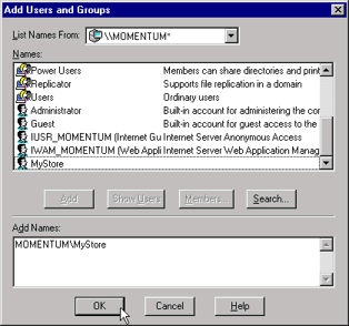 - Click the Show Users button in the middle of the dialog box. From the Names list, select the new merchant account, and then click the Add button. Click the OK button at the bottom of the dialog box.