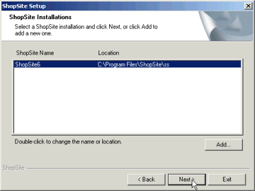 - On the ShopSite Installations screen, select the installation to which you want to add a store and click Next.