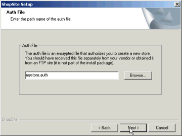 - Before running the install program, you must have a store.auth file for each store that you are going to install. Contact your ShopSite account manager if you do not have these files.
