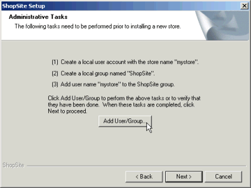 - If you did not create a user account for the merchant before running the setup program, click the Add User/Group button on the Administrative Tasks screen to launch the appropriate IIS application.
