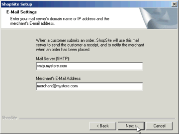 - On the E-Mail Settings screen, enter the name or IP address of your mail server and the e-mail address that ShopSite should use to notify the merchant of new orders.