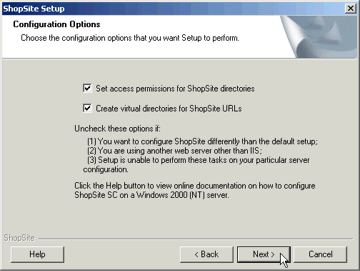 - In the Configuration Options screen, leave the boxes checked to have the setup program set access permissions and create virtual directories. Uncheck either or both of the boxes if you are not using IIS as your web server, or if the setup program encounters an error when running, or if you want to do something unusual with directories and permissions. In any of those cases, you will have to set access permissions and create the virtual directories manually. You can follow the instructions for IIS 5, but if you're using a different web server, you're on your own.