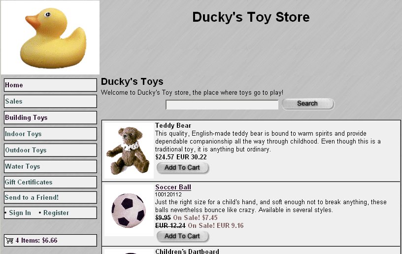 The Cross Sell template puts the universal header at the top of the page, with a row of links across the page below it. These links can include customer registration, Tell A Friend, minicart, and Gift Certficates, if they are enabled. There is a block on the left-hand side of the page that contains the search feature (if enabled) and page links. Products are displayed to the right of the page links. The Cross Sell theme supports all the features in the current version of ShopSite.
