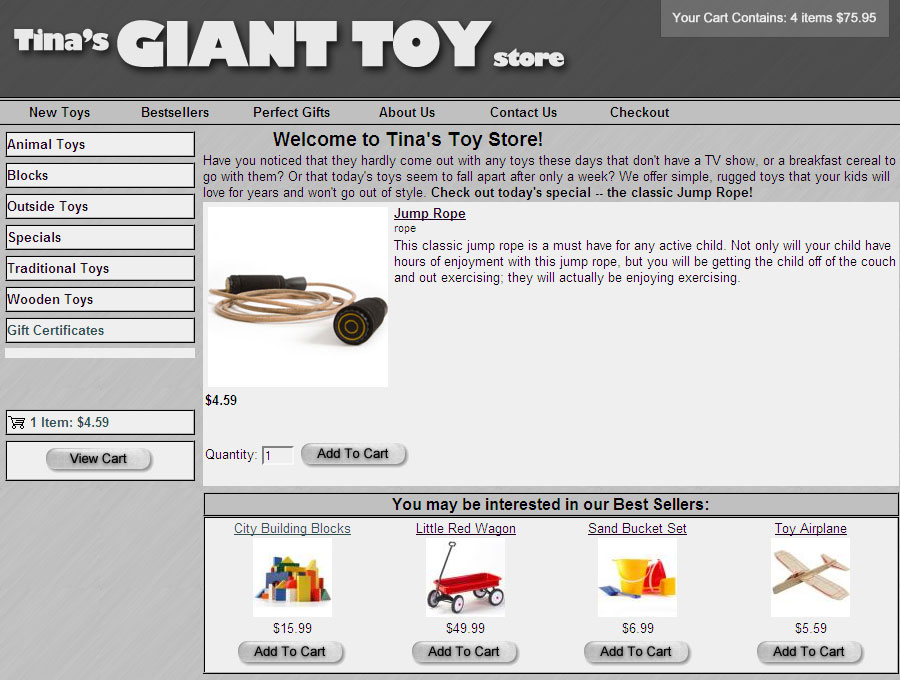 The Cross Sell template puts the universal header at the top of the page, with a row of links across the page below it. These links can include customer registration, Tell A Friend, minicart, and Gift Certificates, if they are enabled. There is a block on the left-hand side of the page that contains the search feature (if enabled) and page links. Products are displayed to the right of the page links. The Cross Sell theme supports all the features in the current version of ShopSite. |