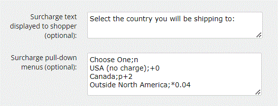 To create a drop-down list of surcharges, enter a description of the surcharge in the Surcharge Text box. Then enter each possible surcharge on a line by itself. Each line must have the name of the surcharge (e.g., country) that you want to show up in the drop-down list, followed by a semi-colon (;) then an operator character, and the value to add or subtract. Valid operators are: