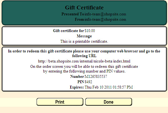 • E-mail (digital) - An e-mail certificate can be automatically delivered to the recipient's e-mail address. Here is an example of how the gift certificate might appear to the recipient: