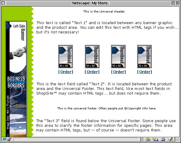 The default template uses a straight-forward "top to bottom" approach. The universal header is placed at the top of the page, followed by the banner graphic and the Text 1 field. Any products and links to other pages appear under the Text 1 field. The Text 2 field is under the links, and the bottom of the page has the universal footer and then the Text 3 field. |