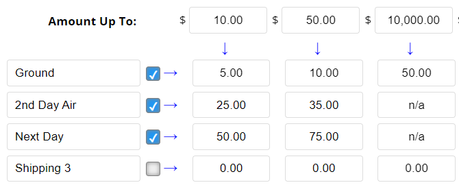 "N/A" can be used for currency amounts for which you don't want to provide a particular shipping option. For example, all the products you offer are lightweight so you have a good idea of what 2nd Day and Next Day shipping would cost for orders under $50. But beyond that, you are not sure so you only want to offer ground shipping. By entering n/a for the price on orders over $49.99 the 2nd Day and Next Day Shipping options will not display.